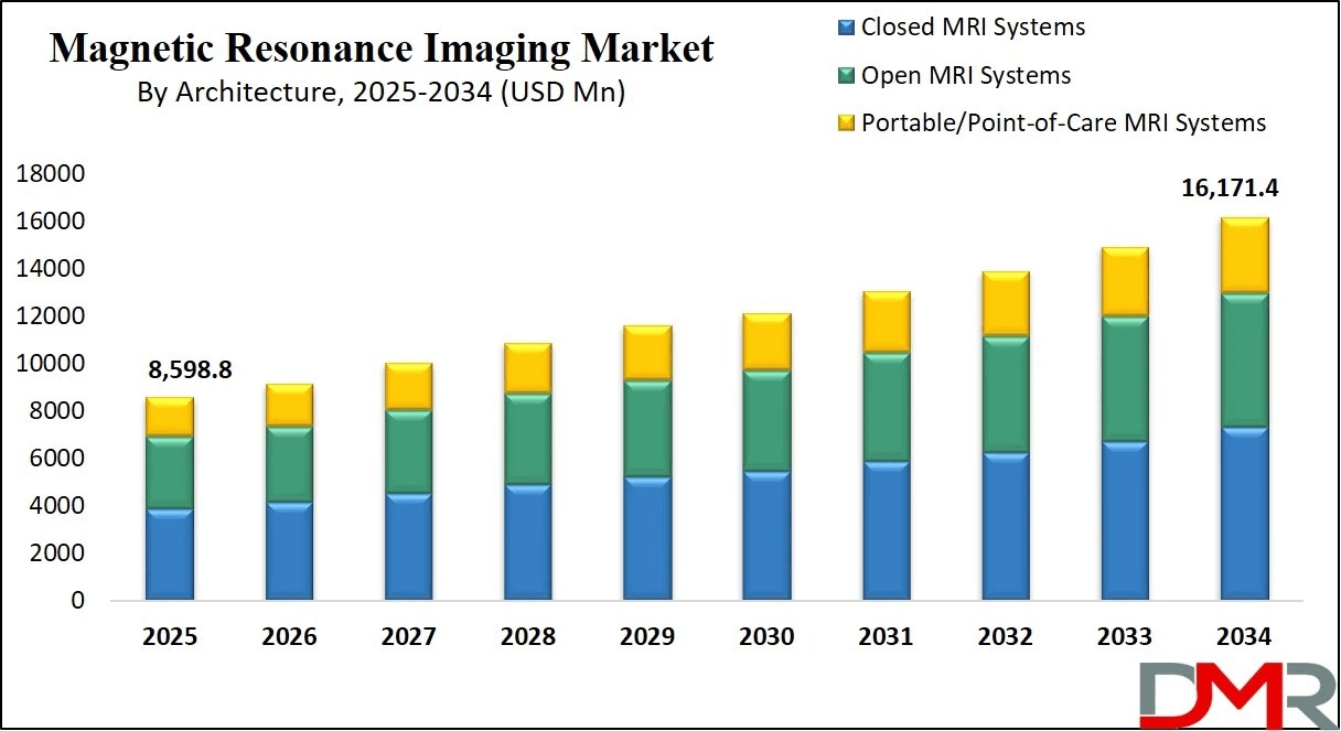 The Global Magnetic Resonance Imaging Market is witnessing significant growth as healthcare providers increasingly rely on advanced imaging technologies to diagnose, monitor, and treat a variety of chronic conditions. Magnetic resonance imaging (MRI) systems offer non-invasive, radiation-free diagnostic solutions that deliver high-resolution anatomical and functional images, making them an essential tool across neurology, cardiology, oncology, and musculoskeletal care. The global MRI market is projected to reach USD 8,598.8 million in 2025 and grow at a compound annual growth rate (CAGR) of 7.3% to attain a value of USD 16,171.4 million by 2034. Key factors driving this growth include rising prevalence of chronic diseases, technological advancements in imaging systems, and increasing adoption of ultra-high-field MRI devices that improve diagnostic precision and patient outcomes.
