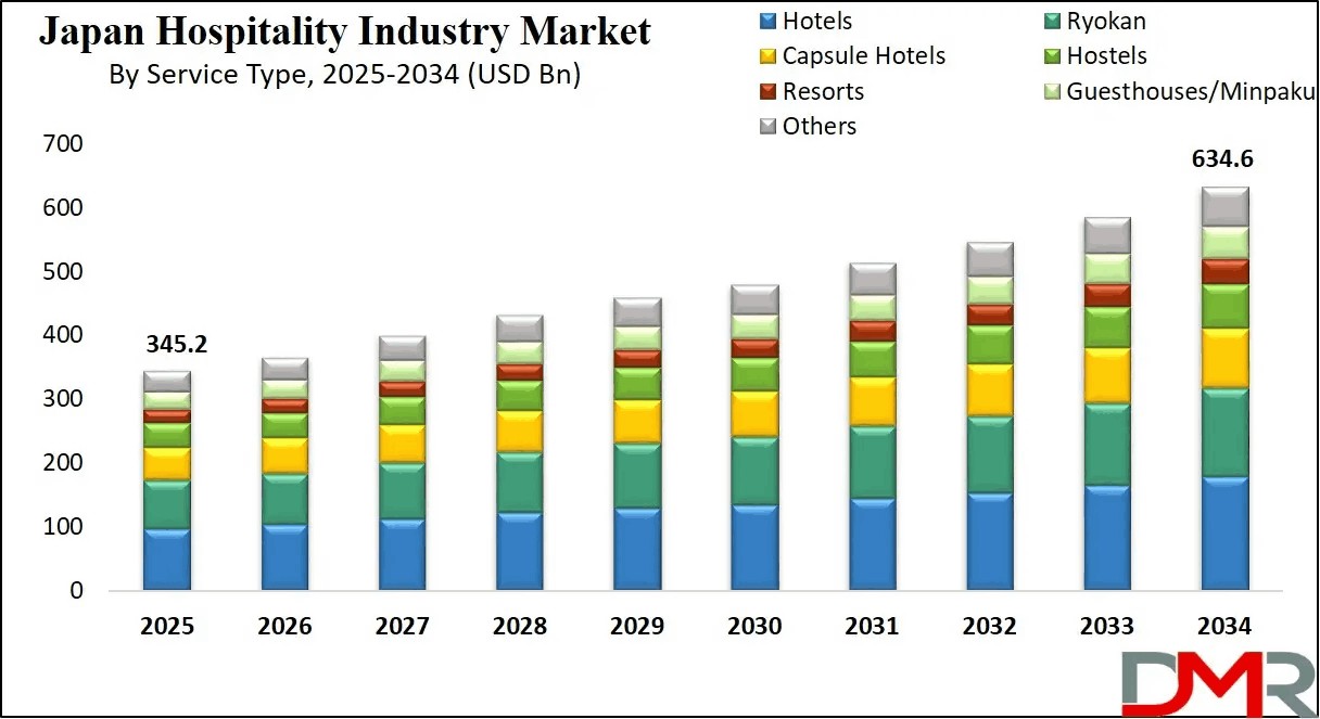 The Japan Hospitality Industry Market is projected to reach USD 345.2 billion in 2025 and is anticipated to grow at a compound annual growth rate (CAGR) of 7.0%, reaching USD 634.6 billion by 2034. This growth is driven by the strong rebound of international tourism, with foreign visitor arrivals surpassing pre-pandemic levels in early 2025. Domestic travel also contributes significantly, fueled by government-led campaigns, regional tourism development, and an increasing appetite for leisure and cultural experiences.